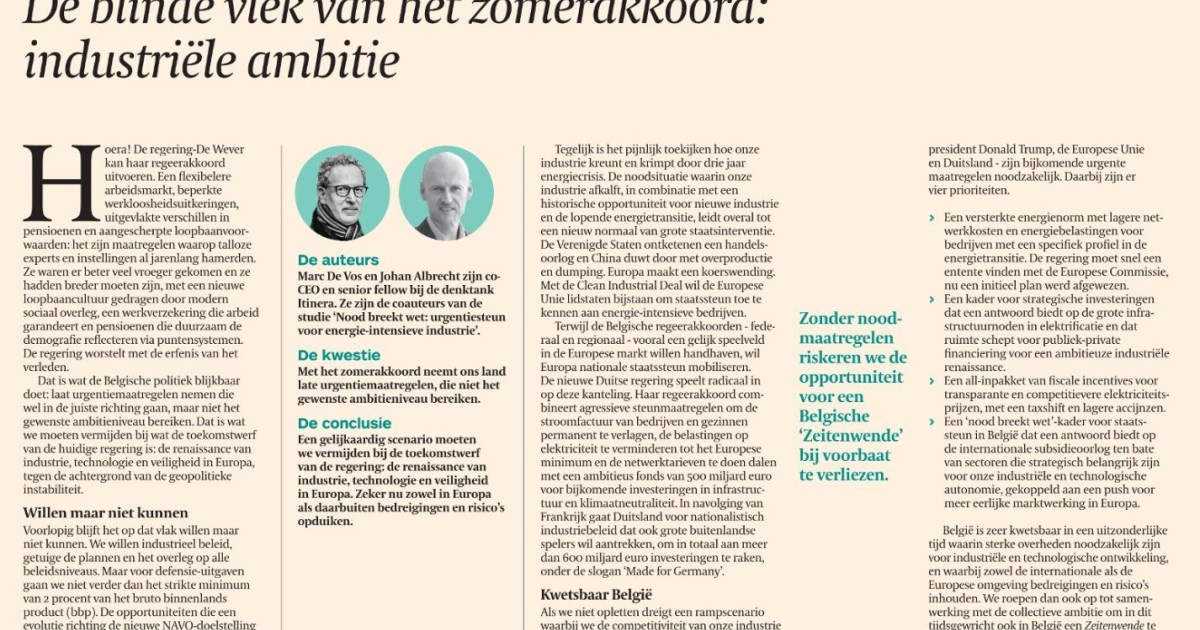 Met het zomerakkoord heeft ons land laat urgentiemaatregelen genomen die niet het gewenste ambitieniveau bereiken. Dat moeten we vermijden bij de toekomstwerf van de regering: de renaissance van industrie, technologie en veiligheid in Europa.