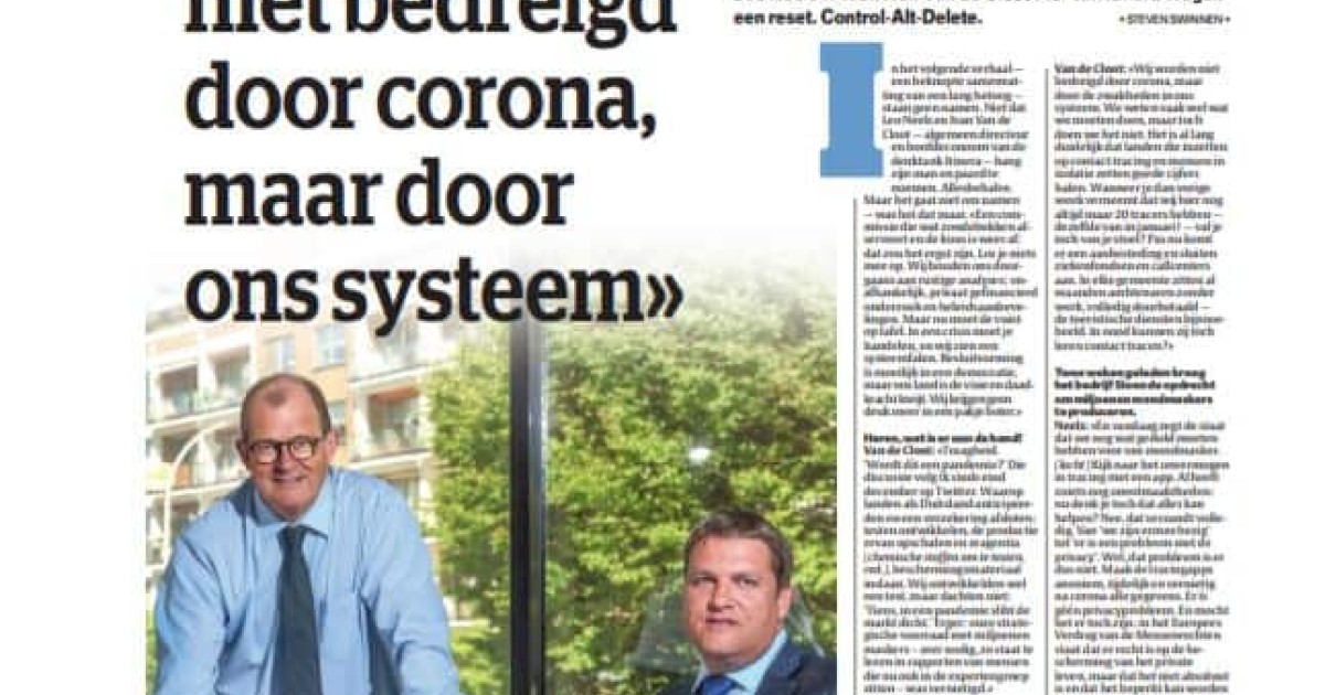 In een interview in de krant Het Laatste Nieuws, gepubliceerd op 09 mei 2020, vragen CEO Leo Neels en hoofdeconoom Ivan Van de Cloot een reset van het land. «België is een roestige oldtimer met drie platte banden, een verdwenen vierde wiel, een geblokkeerde motor en zeven regeringen achter het stuur.» Maar één van de weinige voordelen van crisissen is dat ze een momentum voor verbetering kunnen zijn — of toch voor wie dat wil.